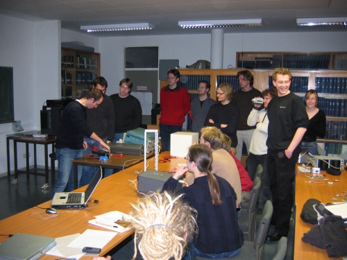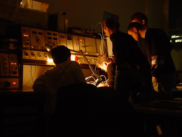 | Die Lichtgruppe bei der Arbeit: der Testaufbau wird verkabelt | Bild: Johannes Twittmann |